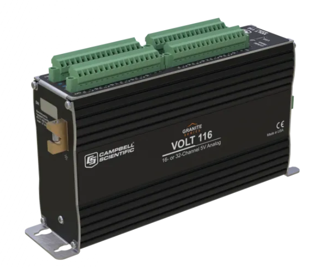 GRANITE ™ VOLT 116 là một mô-đun đầu vào Analog cho phép bạn dễ dàng mở rộng datalogger Campbell Scientific của mình. VOLT 116 có 16 kênh đầu vào vi sai hoặc 32 kênh đầu vào một đầu và bốn kênh kích thích. Nó cung cấp hai cổng 12 V và hai cổng 12 V chuyển mạch để cấp nguồn cho các thiết bị ngoại vi của bạn, cũng như bốn cổng 5 V chuyển mạch để điều khiển ngoại vi. VOLT 116 có bộ chuyển đổi tín hiệu tương tự sang kỹ thuật số 24-bit và đầu cuối tương tự có độ ồn thấp để cung cấp cho bạn các phép đo tương tự vượt trội. Mô-đun này cũng hỗ trợ các phép đo trung bình theo chu kỳ và bao gồm cả kênh kích thích dòng điện và điện áp.