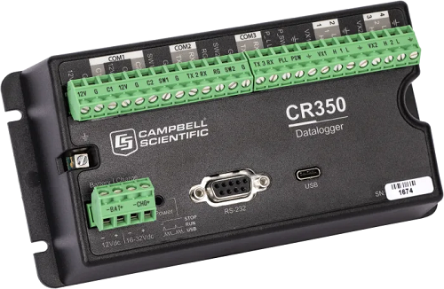Bộ thu và xử lý dữ liệu CR350 là bộ Datalogger đa chức năng gọn nhẹ giá thành rẻ. Thiết bị được tích hợp các đầu Terminal có thể tháo rời. Nâng cấp cổng giao tiếp so với model CR350 có thể đo được hầu hết các loại cảm biến trong lĩnh vực thủy văn học, khí tượng học môi trường công nghiệp. Thiết bịsẽ tập trung dữ liệu tạo cơ sở sẵn có trên nhiều mạng lưới khác nhau và truyền tải sử dụng giao thức truyền thông tương ứng.Model CR350 cũng được tiến hành tự động tại hiện trường hoặc từ xa để điều khiển và giao tiếp M2M. Model CR350 được ứng dụng lý tưởng trong các dự án có quy mô nhỏ yêu cầu quan trắc tự động từ xa trong thời gian dài.