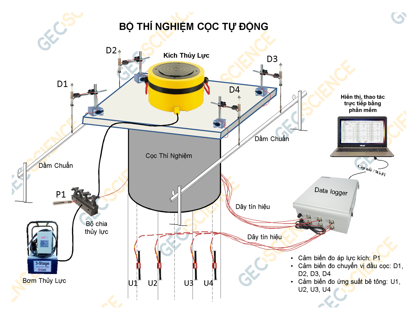 Bộ thí nghiệm cọc tự động với các cảm biến đo chuyển vị đầu cọc, cảm biến đo áp lực kích, cảm biến đo ứng suất bê tông (Tùy chọn) được kết nối về bộ đo tự động Data Logger. Các thông số được tự động thu thập, phân tích, xử lý, hiển thị, và trích xuất số liệu báo cáo.